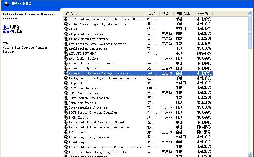 開始---控制面板---管理工具---服務,打開如下圖,看看Automation  License Service 是否是“自動”的狀態,如果不是的話雙擊它 ,把啟動類型改為 自動。