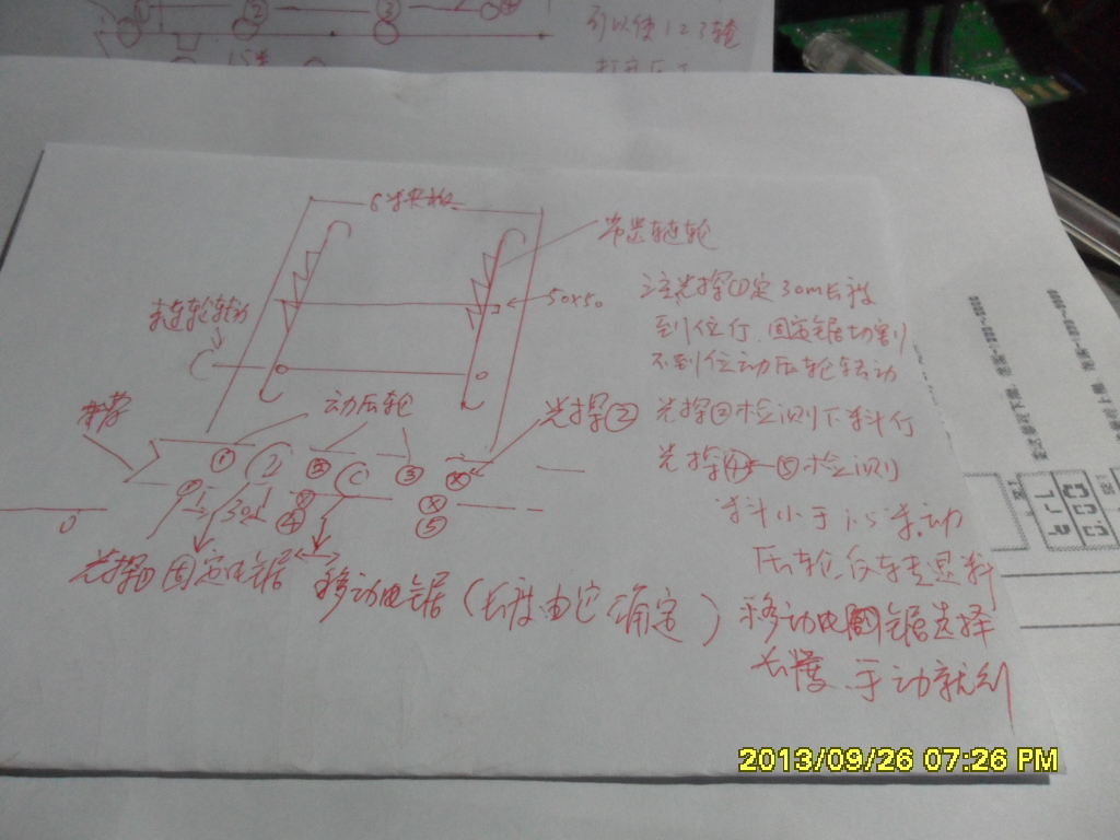 說明.;動壓輪(用作物料移動的動力)可以聯(lián)動(3個用一個連桿,而且可以打開壓下,這樣可以用一個電機)或者3個定壓輪。下面放一動壓輪.控制動壓輪來確定長度,.一個光探(或其他)放在頭部用來確定30MM長度,同時控制后面物料的到位,2個光探用于確定是否小于1.5M,(小于1,5的話壓輪反轉(zhuǎn)退廢料),再用一個光探確定物料是否到位(是的話鏈輪停止送料).切刀用兩把(可以抬起,落下)一把切30MM.一把也可以做成移動的,用于控制長度.另外切刀可以在壓下前轉(zhuǎn)動,也可以一直轉(zhuǎn)動.槽不用連體,切刀的地方空開,這樣鐵末就下去了,有了這些下面的就是程序了。