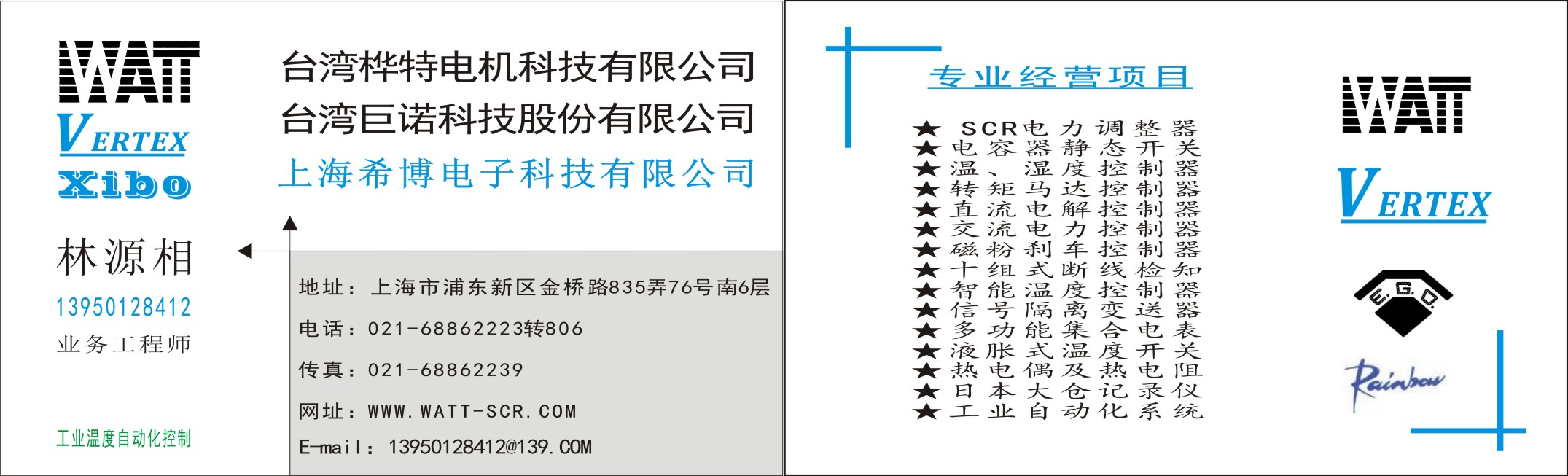 ※主要產(chǎn)品有臺灣樺特WATT電力調(diào)整器(SCR)又稱晶閘管可控硅、功率調(diào)整器、調(diào)功器(W2 W3 W5 M5 WS)系列;※巨諾溫控儀器儀表VERTEX(VT4826 VT7226 VT9626 VT9630等)、傳感器;※臺灣運(yùn)泰比例連動、變位式捲取、放料控制器;※臺灣儀控溫度控制器TAIE(FY400 FY700 FY900 FA200 FA211等);※并承接工業(yè)自動化PLC、HMI、伺服系統(tǒng)設(shè)計與信息系統(tǒng)融合;※自動PID溫度控制系統(tǒng)等。