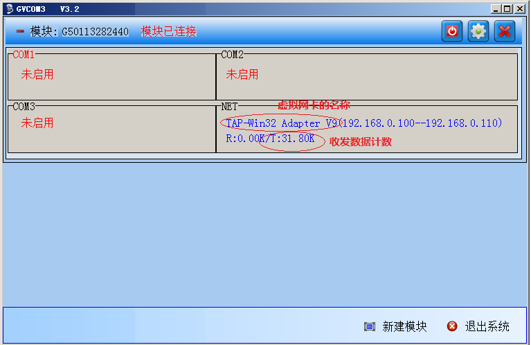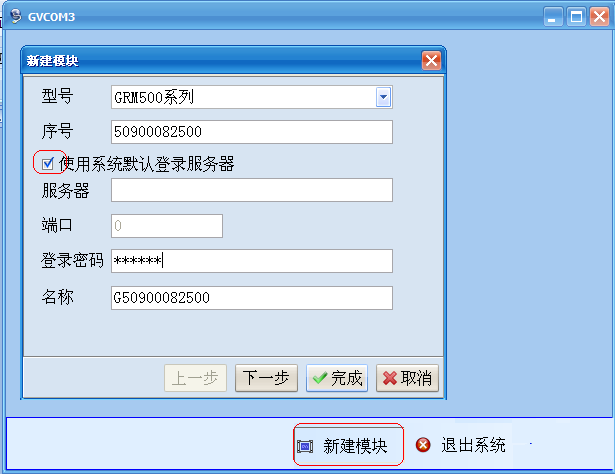 1、電腦上運行GVCOM3軟件,點擊下面的“新建模塊”,輸入GRM500模塊11位序號和密碼。