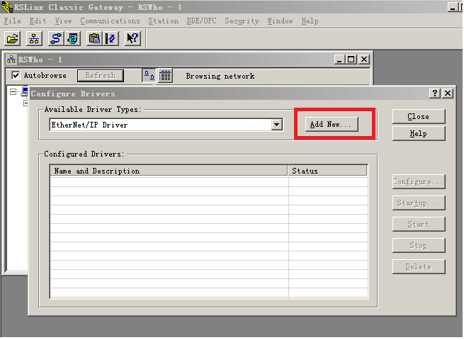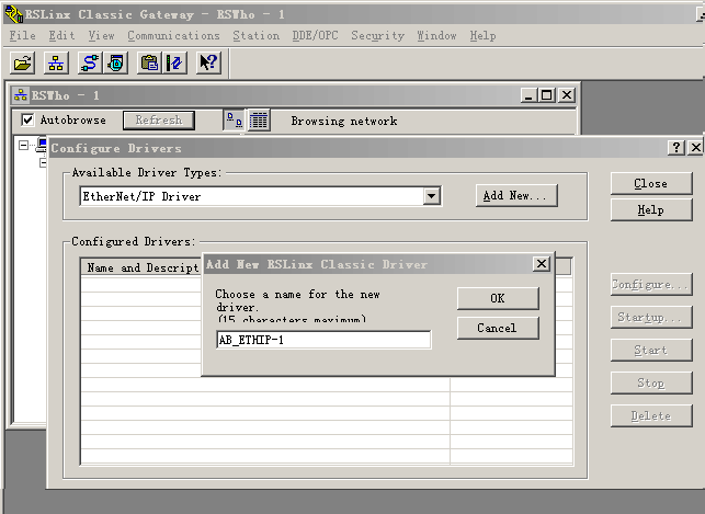 4、 AB的RSLinx Classic軟件,打開Configure Drivers對話框,如下圖所示,選擇“Ethernet/IP Driver”,點擊“Add New…