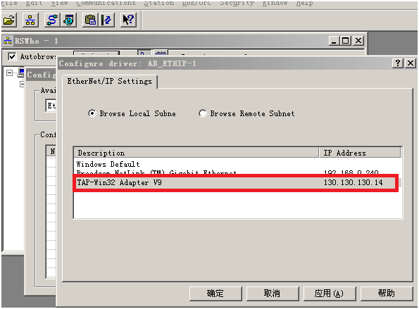 5、點擊OK。點擊“Configure…”,選擇模塊網口通道使用的網卡適配器TAP-WIN32 Adapter V9,點擊“確定”。