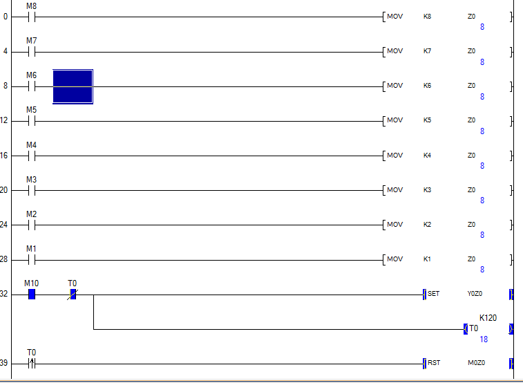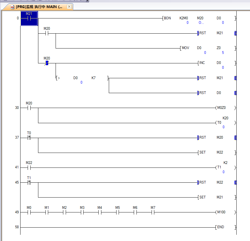 操作沒問題,但是你狀態輸入的M0~M7被你自己清空了,你的判斷只能執行一次,不能循環了。加一步按鈕狀態的轉存,大于7的時候再加載就可以用了。