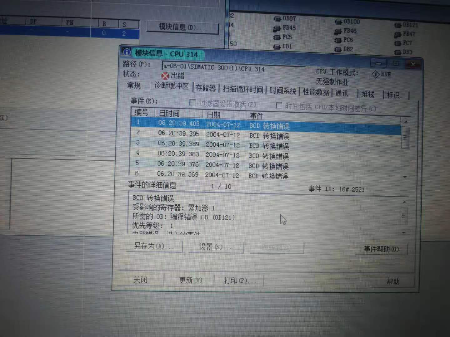 故障現象:CPU  314   的SF燈顯示紅色,通過在線診斷緩沖區檢測提示BCD轉換錯誤。