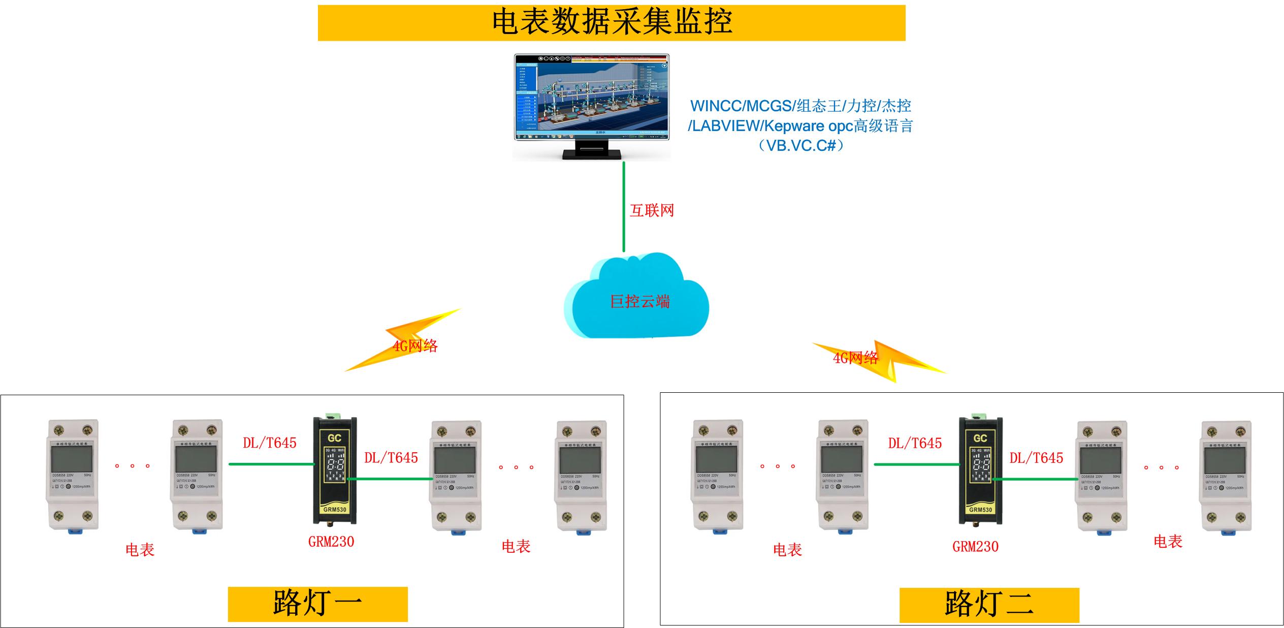路燈使用支持DLT645規約的電表采集電能數據,通過485一個串口帶多臺電表,通過4G發送到手機APP和組態王上面做個集中監控