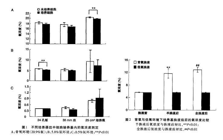 培養基中的氧含量可以隨著外界氧環境的變化而改變,具體情況如下低氧環境下24孔板和35 mm皿中的氧含量要比25cm2培養瓶穩定;常氧環境下換液使得培養基內的氧含量明顯升高,而在低氧環境下換液則對培養基內的氧含量無明顯影響。由上可得知在不同氧濃度下的細胞培養模型研究中,嚴格控制外界環境中的氧濃度,選用合適的細胞培養容器,并且在換液過程中盡量避免或減少培養基與常氧環境的接觸,是維持培養基內氧含量穩定的重要因紊。