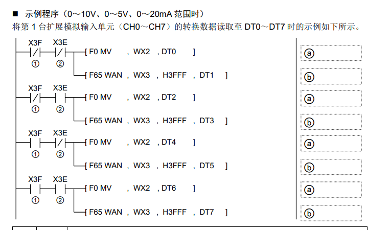 PLC布局:FP-XH C60T + 3個 FP-X E30R IO擴展 + AFPX-EFP0適配器 + AFP0RAD4 模擬量模塊程序是按照手冊上寫的,但目前CH0對應地址WX2數據是0。