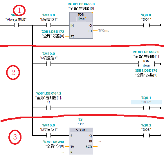 接通延時器常用的有三種。1/2是博途平臺的,3是兼容舊step7平臺的;博途平臺數據類型是IEC_TIMER,舊定時器3號是Timer類型,并且小伙伴要注意它不能在DB中組態;其中2號只能放到邏輯最右側,不能像其它兩種直接輸出Q線圈;如果3號TV管腳用word類型則1表示0.01秒,否則用原數據類型“S5t#5s”即可。
