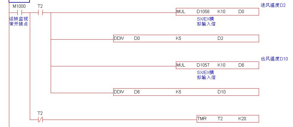 4-20MA的溫度變送器連到DVP10SX11R自帶的輸入模擬量上,如果溫度變送器是4-20mA,那么只要接線時PLC的模擬量上接成電流輸入型的就可以,程序上不用把4MA對應400,20MA對應2000來做?另外模擬量輸出時,變頻器信號用4-20mA時,程序中就要做數據換算,4mA對應400,20mA對應2000了
