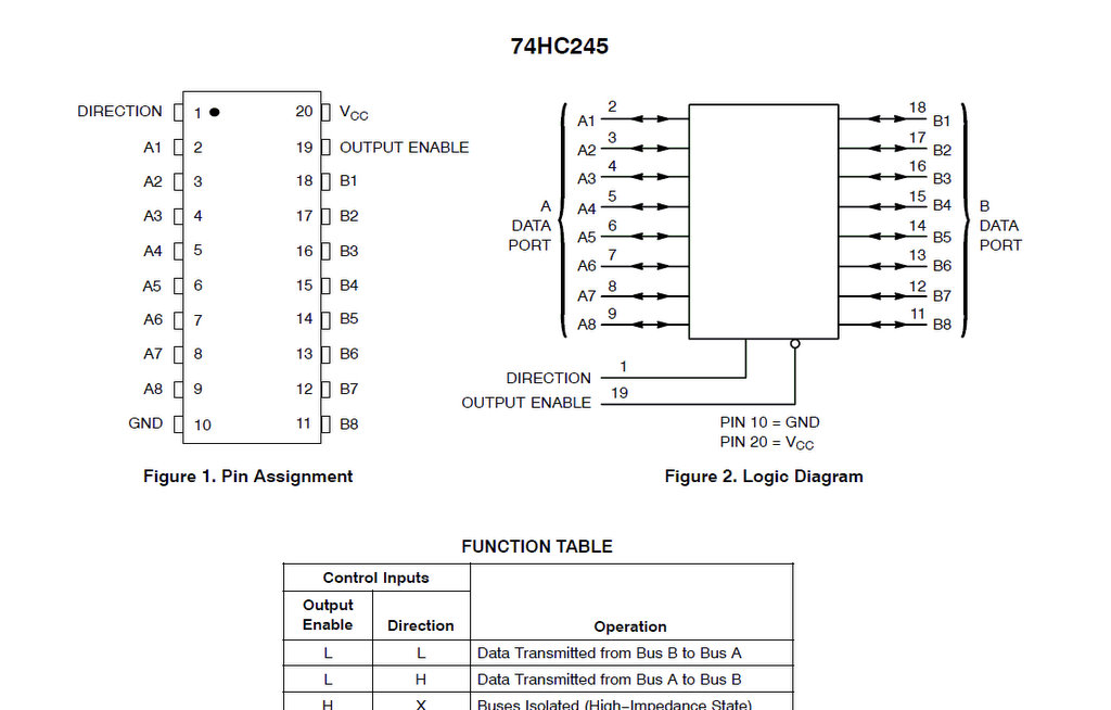 1=DIR ,2~9=A0~A7,10=GND,18~11=B0~B7,19=OE,20=VCC