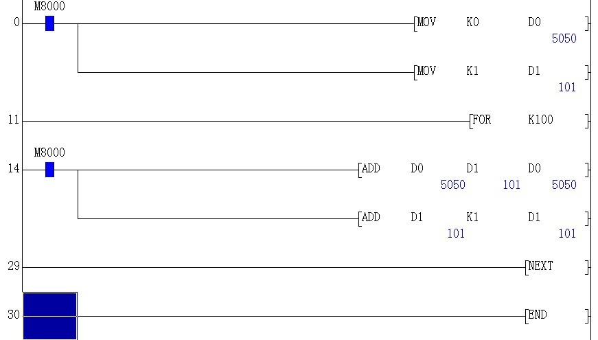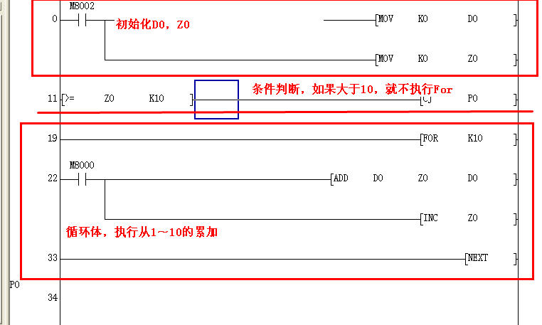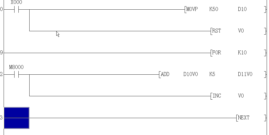 我電腦上現在無法模擬,但從程序分析,最初的程序的確是沒考慮到v0到10以后的問題,換句話說,也就是x0接通給D10賦值之后的第二第三及至更后掃描周期,原賦值循環程序將繼續無限制執行,直到出錯