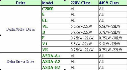 四、    AFE2000可搭配臺達交流驅動器產品如表所示