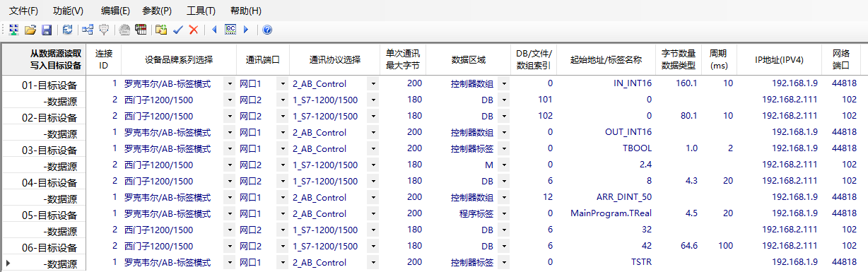 任務(wù)01:讀取西門(mén)子DB101.DBW0開(kāi)始的80個(gè)的INT類(lèi)型的數(shù)據(jù),寫(xiě)入到羅克韋爾AB的IN_INT16控制器數(shù)組(從0開(kāi)始),共160字節(jié);
