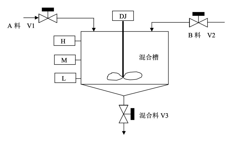 (3)放料階段:攪拌階段結束后,打開出料閥V3,攪拌DJ繼續運轉,到液位下降到L時停止運轉,報