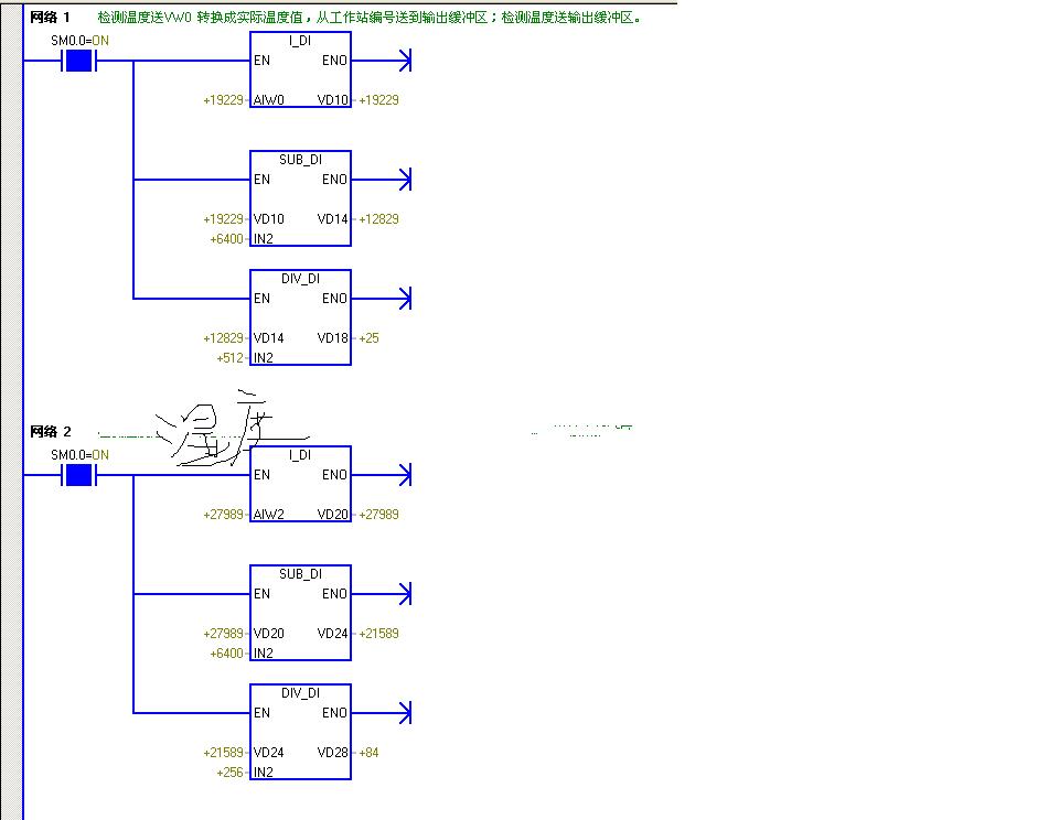 剛學(xué)PLC,請(qǐng)教編程問(wèn)題:溫濕度傳感器溫度測(cè)量范圍為0~50溫度輸出4~20MA,濕度為0~100%,輸出4~20MA,大俠們幫看下我程序,這樣轉(zhuǎn)換對(duì)嗎,或有什么好的建議,謝