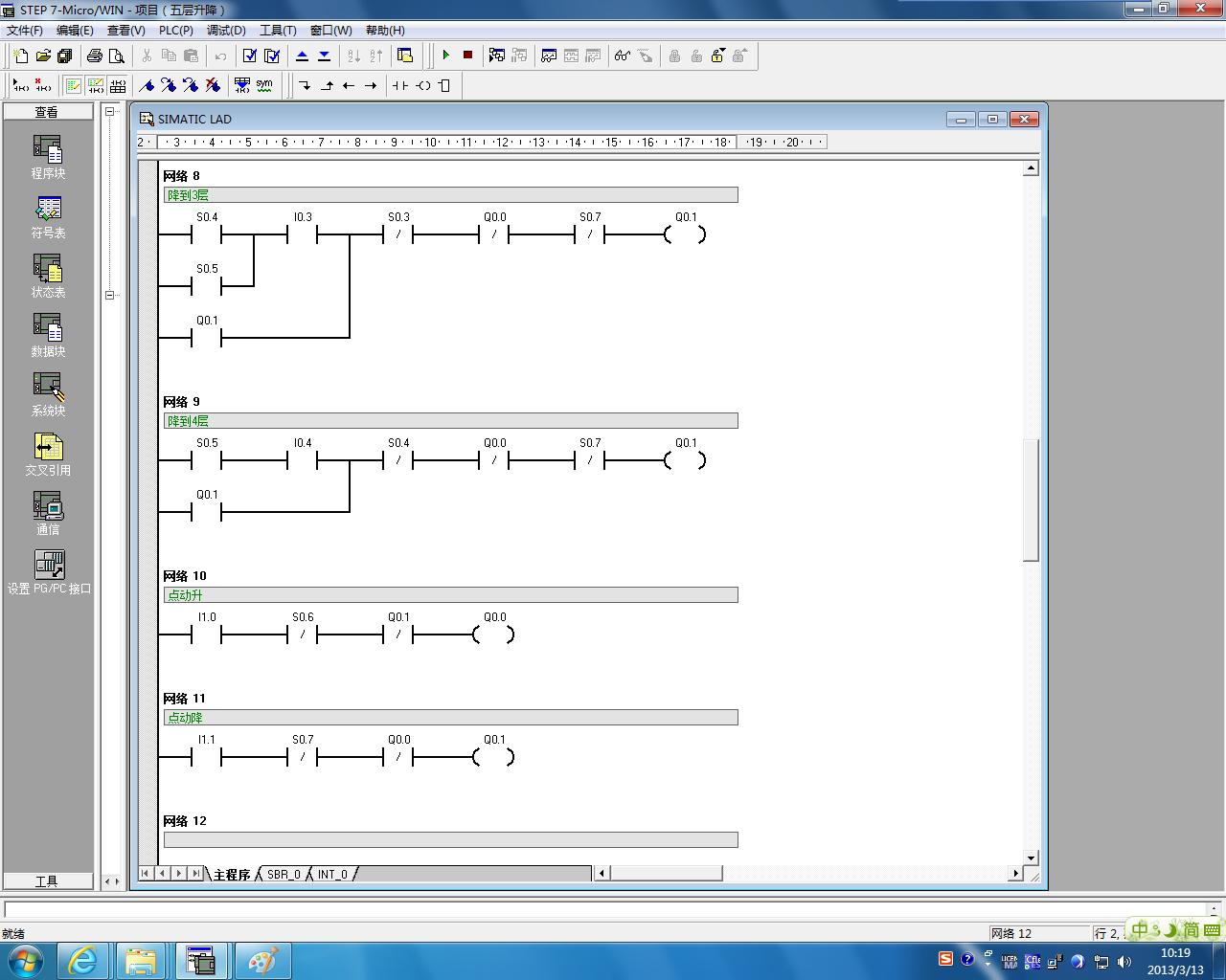 TITLE=i0.1第一層   i0.2第二層 i0.3第三層 i0.4第四層 i0.5第五層      s0.1-s0.5為限位接近開關(guān)     上升線圈q0.0 下降線圈q0.1