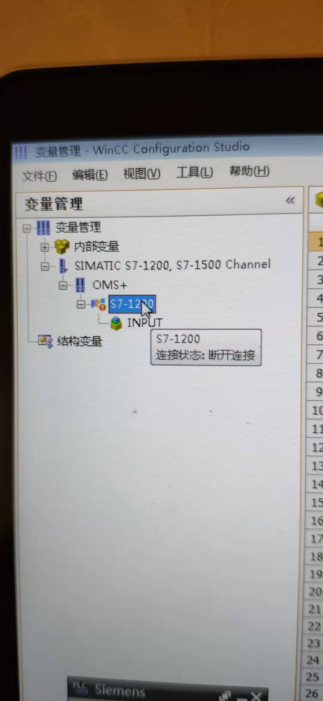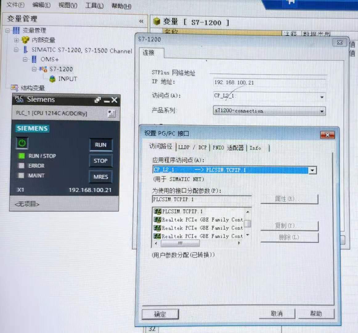 請各位高人幫忙看一下,我在電腦上配置WINCC與PLCSIM進行連接,但一直顯示連接斷開的狀態,系統為WIN10+WINCC7.4SP1+S7-PLCSIM V15.1+TIA Portal V15.1,組態配置如下圖