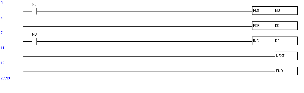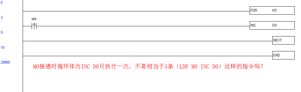 第一張圖里M0接通D0+1,第二張圖里M0接通D0+5,我的理解是第一張圖里第一次循環(huán)M0會產(chǎn)生上升沿,剩下的循環(huán)M0一直接通不會再有上升沿。第二張圖里一個循環(huán)里M0一直接通。