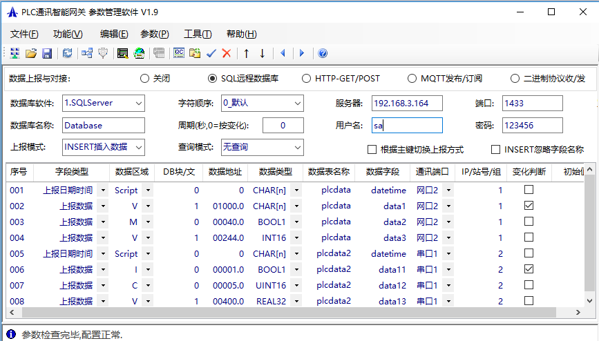 然后通過網關的參數設置工具軟件(在附件中),設置數據庫信息和PLC寄存器地址,周期設置為0,根據數據表中所勾選的變化判斷條件,往對應的數據庫插入一條數據,第2行和第6行數據分別為plcdata和plcdata2的觸發條件,設置如下圖: