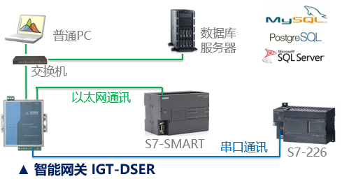 本案例中IGT-DSER智能網關的網口2連接S7-200Smart,串口1接S7-200 CPU226的PPI串口,智能網關的網口1與服務器對接,將數據寫入SQLServer數據庫的兩個數據表中。上報模式為PLC的變量觸發模式,即當PLC的數據有變化時,相應的寄存器的數據寫入對應的數據表中。