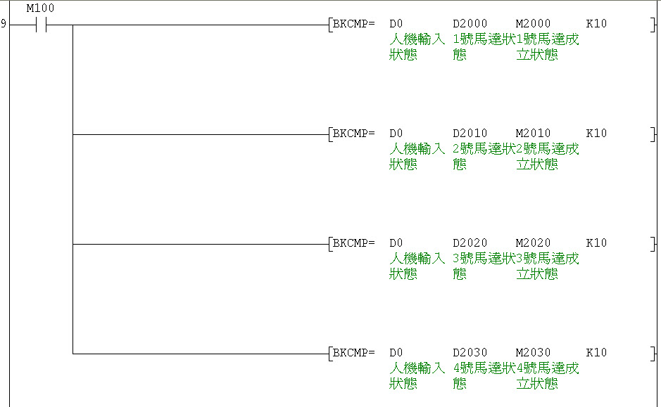 例侞 : D0 輸入的是1號,與D100內容一樣也是1號,就送1號馬達的料,