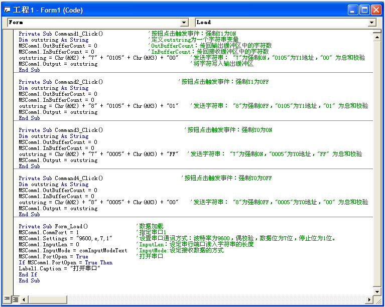 用一個label控件、一個串口通訊控件MSComm1、四個按鈕控件,如上面圖片所示。壓縮文件里面TXT文件是代碼,解壓后可以直接復制使用。