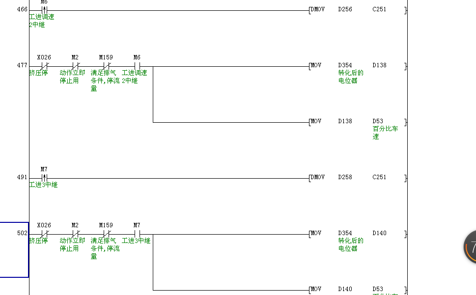 是關于編碼器的一段程序,我剛開始學習plc,找了很多資料都看不懂是什么意思,程序大概的意思應該是在一段距離內,轉動編碼器,可以控制油泵的流量,起到調節油缸的速度,在另外一段距離,可以從復上面的調速。在從復一次,一共三個距離,三段調速。希望看懂的可以給我指點指點,非常感謝。!