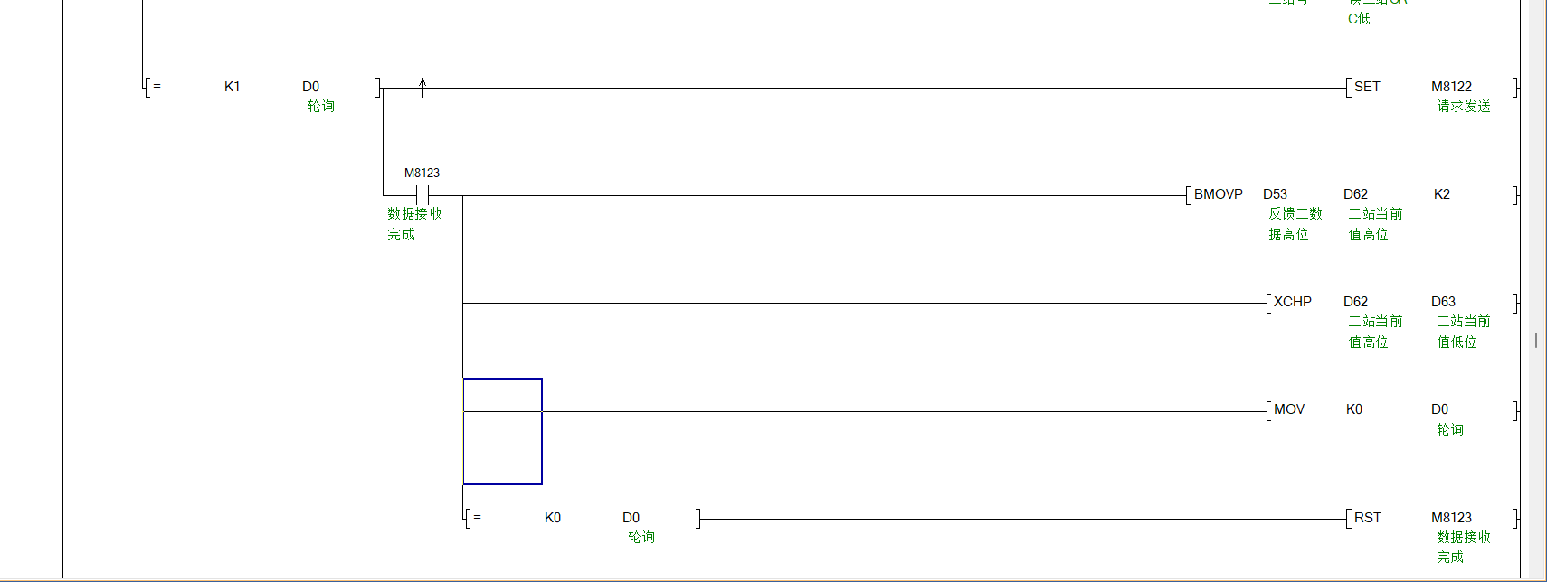 D0=0的時候上升沿置位M8122,同時D0=0的時候等待M8123接通,接通后將數據傳送到別的寄存器,再使D0=1,接著復位M8123。