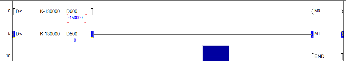 引用引用樓主出入門檻于2017-08-07 21:02發表的 小弟有個疑惑 : 三菱PLC 比較指 令D< -130000 D600 執行后輸出一個點 但是我在仿真軟件上模擬的時候D600是不能為負數的 ,這樣問題就來了這個比較指令的條件是一直滿足也就是一直為1值的 大家幫我看看我分析的對嗎 ? 這是我在看例子程序的時候看到的 。