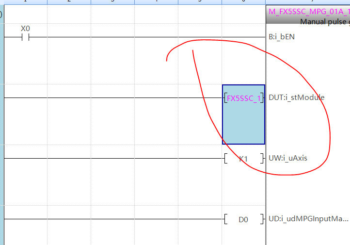 大家好,最近需要做一個工程,感覺FX5U的PLC 使用FX5SSC的簡易運動模塊孔子比較方便,畢竟可以光纖總線控制,驅動器上接線方便。可是在使用時,發現這個 FB不太好用,配置了FX5-40SSC-S模塊后,本想在lad里面插入FB(FX5-40SSC-S對應的 脈沖手輪控制FB),插入后,定義FB的輸入時,有個 輸入點,類型為DUT(結構體),不知如何賦值?請用過的朋友,幫忙指導,謝謝
