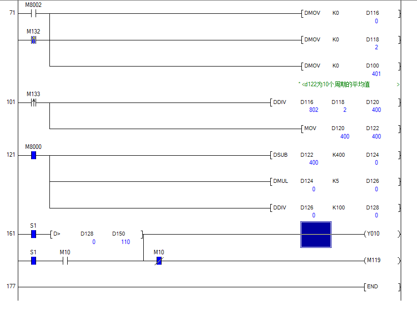 使用了A/D模塊對(duì)電流進(jìn)行轉(zhuǎn)換,為了讓數(shù)字波動(dòng)次數(shù)少一點(diǎn),選擇做10個(gè)運(yùn)算周期的平均值。程序如圖。
