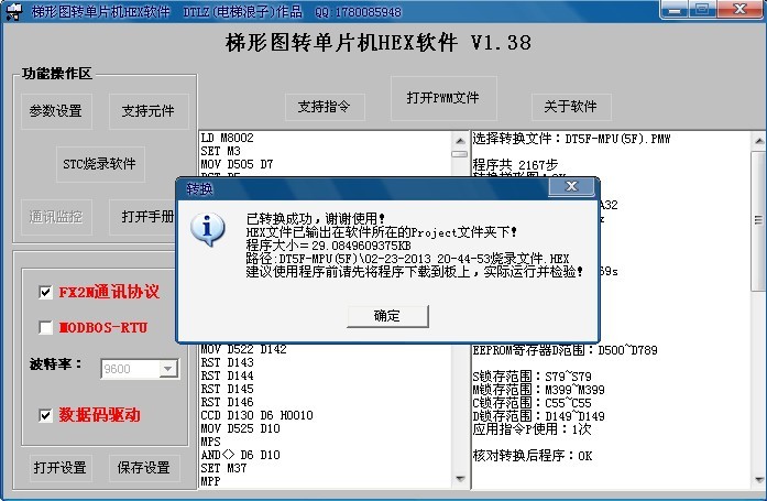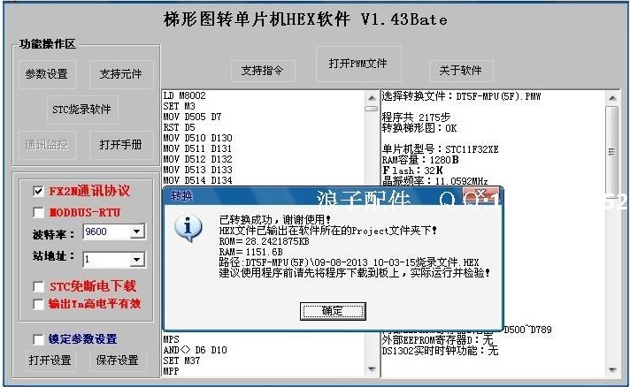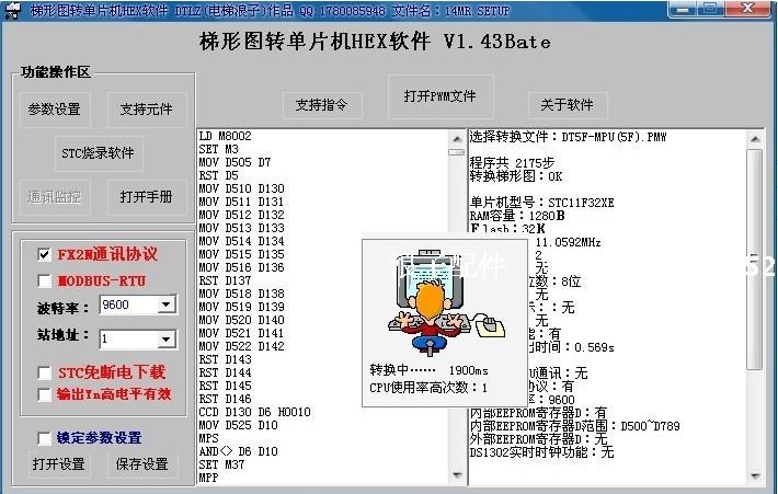 本軟件功能是將三菱FX2N的PLC程序轉換成51單片機HEX文件的程序,本軟件有相當完善的出錯與提示檢測功能(元件范圍檢測,支持的指令檢測,是否FX2N的程序文件檢測,是否FX2N軟元件內存數據文件檢測等等),軟件支持三菱的PLC編程軟件:FXGPWIN與GX Developer(保存時需要保存為FXGP文件);
