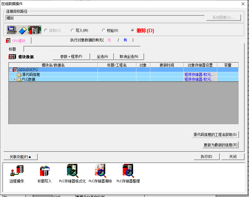 深度拓展,我的這個(gè)工程類型是簡單工程加使用標(biāo)簽,所以多了一項(xiàng)源代碼信息。當(dāng)時(shí)程序還比較小,所以選擇寫入源代碼信息。隨著程序變大,容量不夠用,寫入程序就沒有選擇寫入源代碼信息。但是PLC存儲器里還會有之前寫入的源代碼信息,占用容量,需要手動刪除?赡苡捎诙啻尾粠г创a信息寫入程序,導(dǎo)致很早之前留存在存儲器里的源代碼信息就處于特殊狀態(tài),沒辦法直接刪除通過PLC數(shù)據(jù)刪除功能刪除,最后使用PLC存儲格式化刪除。