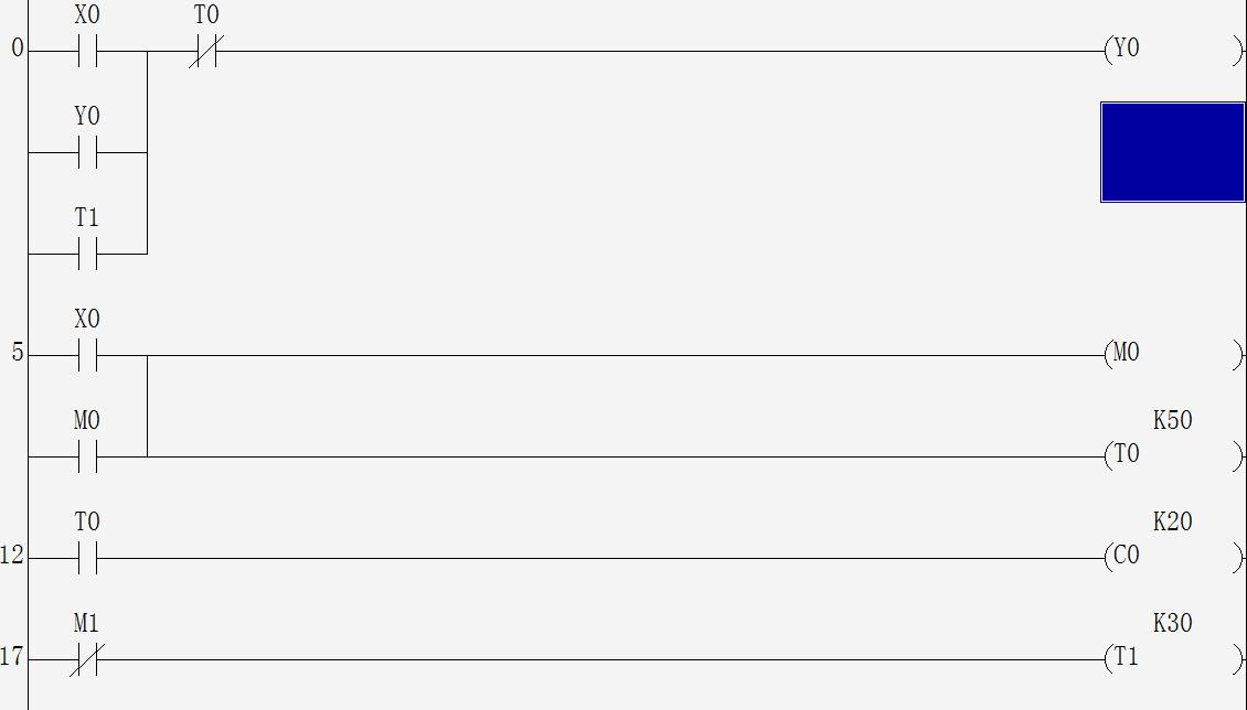 而在你現在的程序里,一旦X0接通之后,M0就會保持在ON的狀態,那么5秒之后將T0導通而無法斷開。