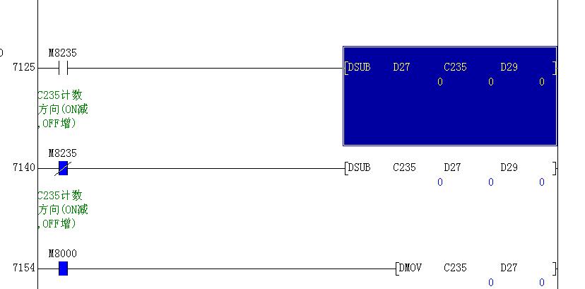 M8235為接通時單向高速計數器C235為減計數模式,緊跟后邊的【 DSUB   D27  C235  D29]是用D27里的數值減去C235里的數值,等于的數值存放在D29里。M8235為斷開時C235是增計數模式,緊跟后邊的【DSUB  C235  D27  D29]的意思是用C235的數值減去D27里的數值,等于的數值存放在D29里。注意DSUB為32位的減法指令,不加D就是16位的。M8000就不說了。最后一行的意思是把C235里的數值傳送到D27里(應該是顯示樓層數的)。