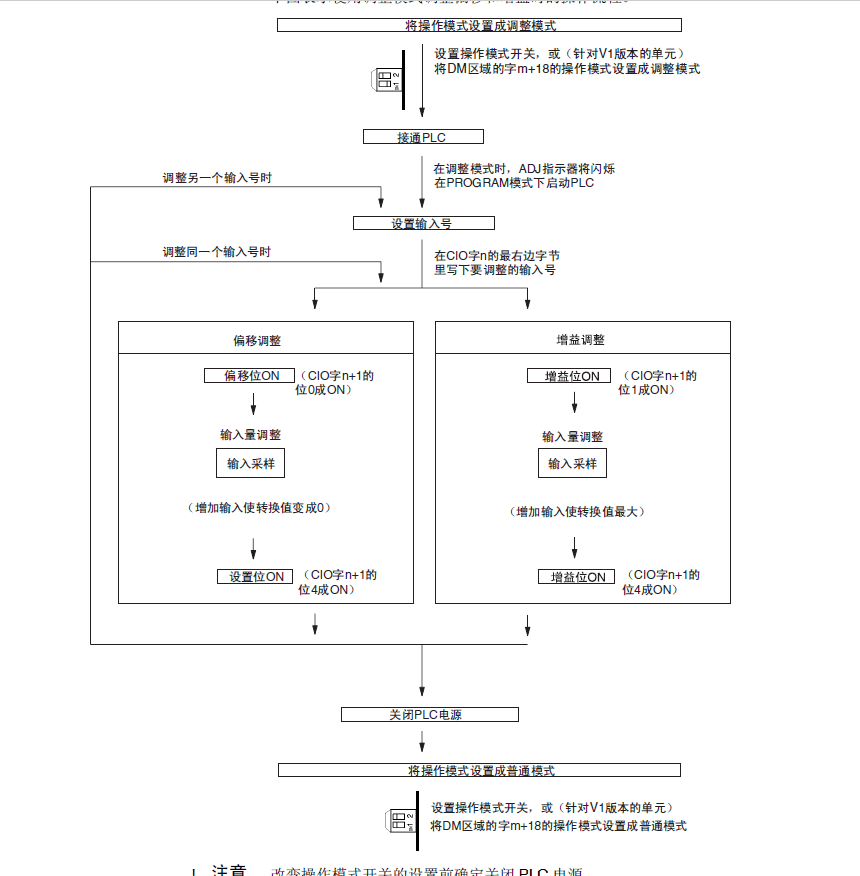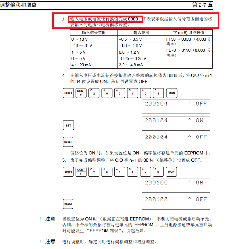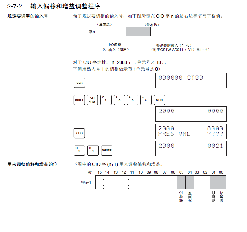 6. 在輸入電壓或電流使得模擬量輸入端子的轉換值為0000 后,將CIO 字n+1