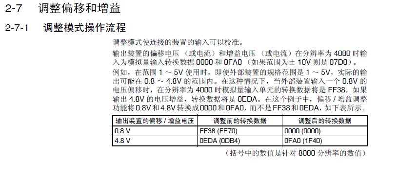 5. 輸入電壓或電流使轉換值變成0000 。下表表示根據輸入信號范圍而定的將