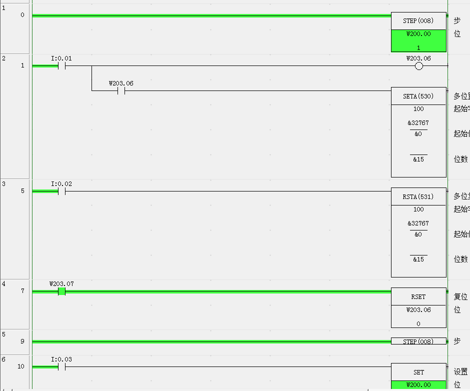 各位朋友,我是用SNXT  STEP 步進方法編程,我這個實驗是當0.03給信號,步進SW200.00工作,當0.01給信號,W203.06工作,于是100.00一直到100.07都工作。問題來了,當我W203.07置1時,強制復位W203.06.當我給0.01信號時,為什么100.00到100.07仍然能工作呢?!