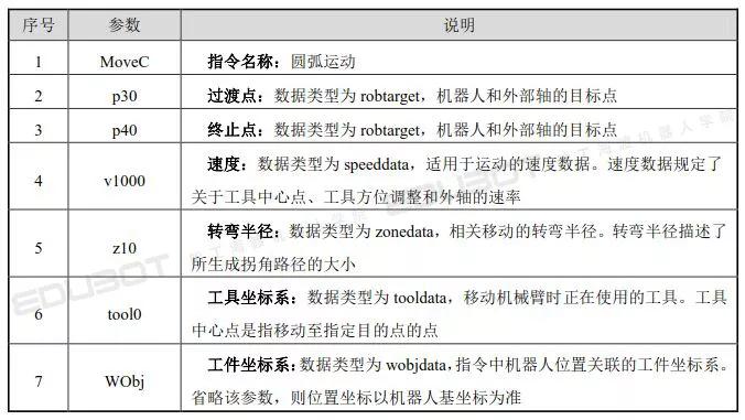 MoveC說明:機器人通過中間點以圓弧移動方式運動至目標點,當前點、中間點與目標點3點決定一段圓弧,機器人運動狀態可控制,運動路徑保持唯一。MoveC指令常用于機器人在工作狀態移動
