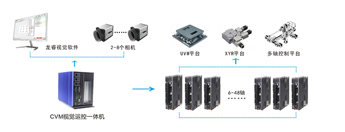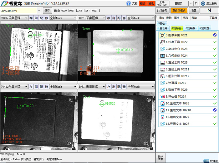 傳統(tǒng)視覺與運動控制項目一般采用視覺系統(tǒng)+PLC或運動控制卡的形式,需要不同的編程人員參與,存在一定難度,需要花費大量時間和精力。視覺龍創(chuàng)新產(chǎn)品“CVM視覺與運動控制一體機(jī)”打破傳統(tǒng)控制流程,不需要開發(fā)人員參與,調(diào)試人員就可以完成整個項目。大幅降低應(yīng)用門檻,縮短項目時間,降低項目成本,售后維護(hù)簡單,將視覺與運動控制項目簡單化。 項目實例 視覺龍“龍馬”運控軟件采用圖形化來表示控制編程邏輯,簡單易用,支持多品牌運動控制如雷賽、固高等;支持單軸和多軸點位運動;支持多軸插補(bǔ)運動,如直線、圓弧;支持位置比較功能(飛拍);支持多種運動模型,如碼垛等。 此例程為標(biāo)簽自動貼合設(shè)備電控+視覺定位程序介紹 設(shè)置2個設(shè)置插補(bǔ)軸坐標(biāo)系,一個3軸,一個2軸。 00程序:運動到糾偏拍照點 01程序:運動到糾偏拍照點 02程序:給視覺系統(tǒng)發(fā)出拍照指令 03程序:接收到視覺系統(tǒng)糾偏指令進(jìn)行糾偏 04程序:運動到復(fù)檢拍照點,發(fā)出復(fù)檢拍照指令 00程序:DI0輸入上升沿信號,RXY軸運動到0,100000,-100000后發(fā)出通知事件1。 01程序:通知事件101有效,RXY軸運動到0,100000,-100000后發(fā)出通知事件1。 02程序:通知事件1有效,延時后發(fā)出通信指令rofA0A100000A-100000,其中A為間隔符,由視覺軟件設(shè)置。 03程序:通知事件100有效(有視覺軟件發(fā)出),按照視覺發(fā)出的糾偏坐標(biāo)進(jìn)行糾偏,糾偏完成后發(fā)出通知事件。 04程序:通知事件有效,延時后發(fā)出通信指令robA100000A-100000,觸發(fā)視覺任務(wù)5進(jìn)行復(fù)檢。 采用視覺龍自主研發(fā)的“龍睿”視覺軟件定位引導(dǎo)算法,定位精度可達(dá)到1/40亞像素。支持多種運動平臺定位和對位功能,可以實現(xiàn)裝配、上下料、傳送帶跟蹤、打磨、碼垛、切割、打標(biāo)等應(yīng)用。 視覺系統(tǒng)定位標(biāo)簽位置 視覺系統(tǒng)定位標(biāo)簽在吸嘴上位置 視覺系統(tǒng)定位貼合產(chǎn)品的位置 視覺系統(tǒng)復(fù)檢最終貼合狀態(tài) 視覺系統(tǒng)計算出糾偏絕對位置坐標(biāo),生產(chǎn)數(shù)據(jù)格式為 WRITE#XYR#/-74.836/-305.300/-137.200 運動系統(tǒng)運動到該位置,完成糾偏。 |