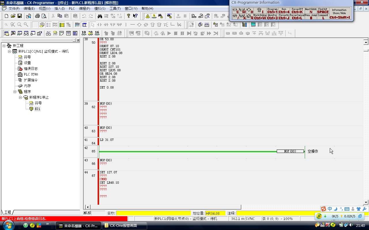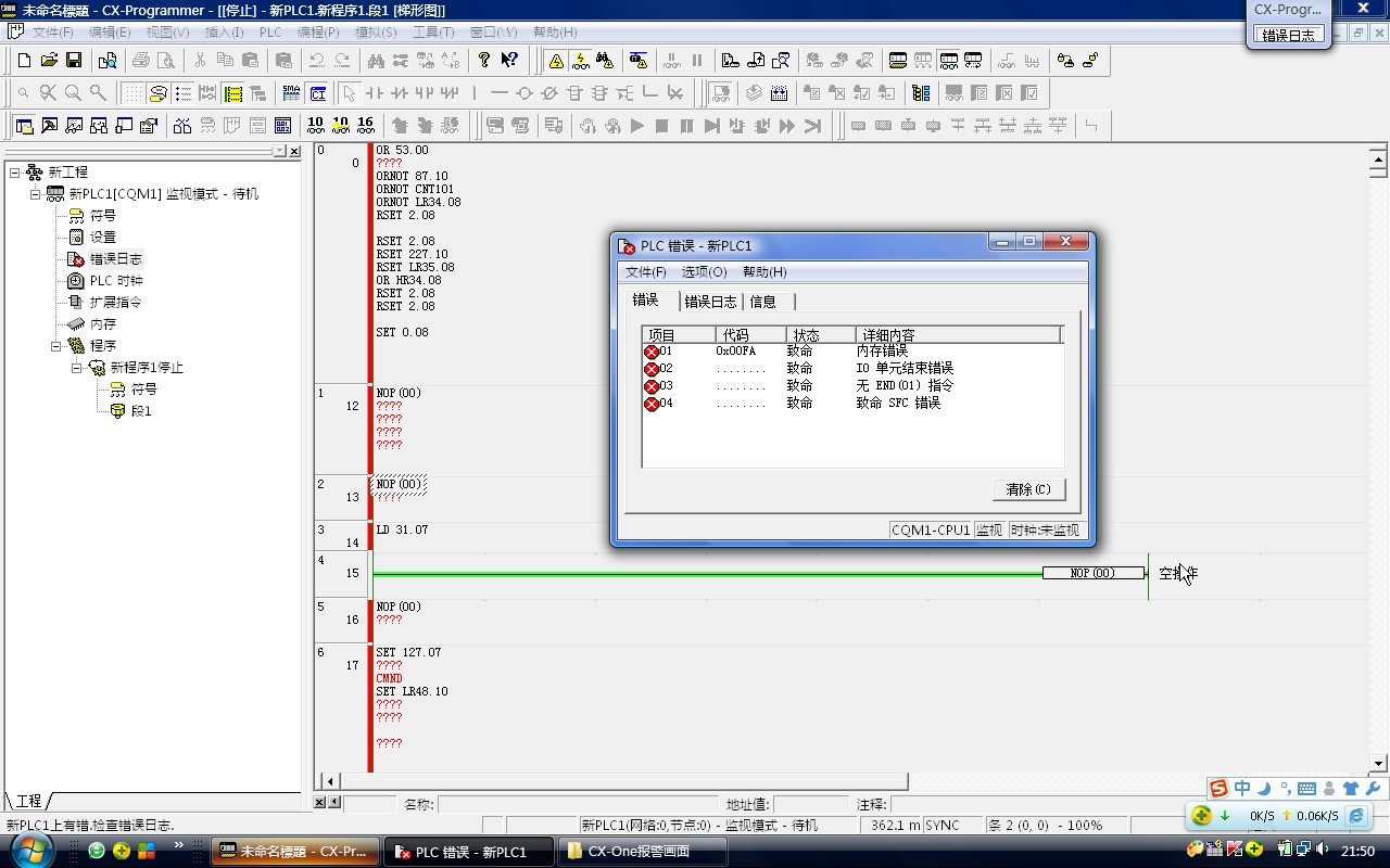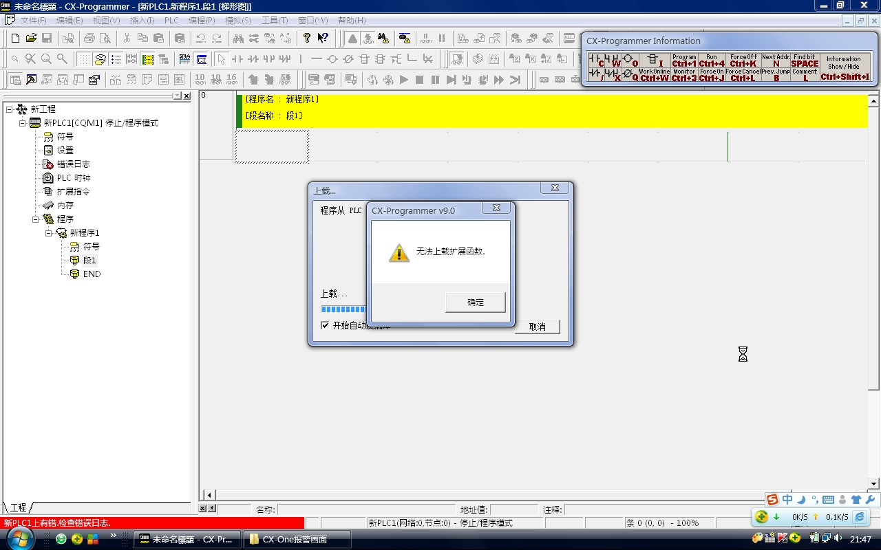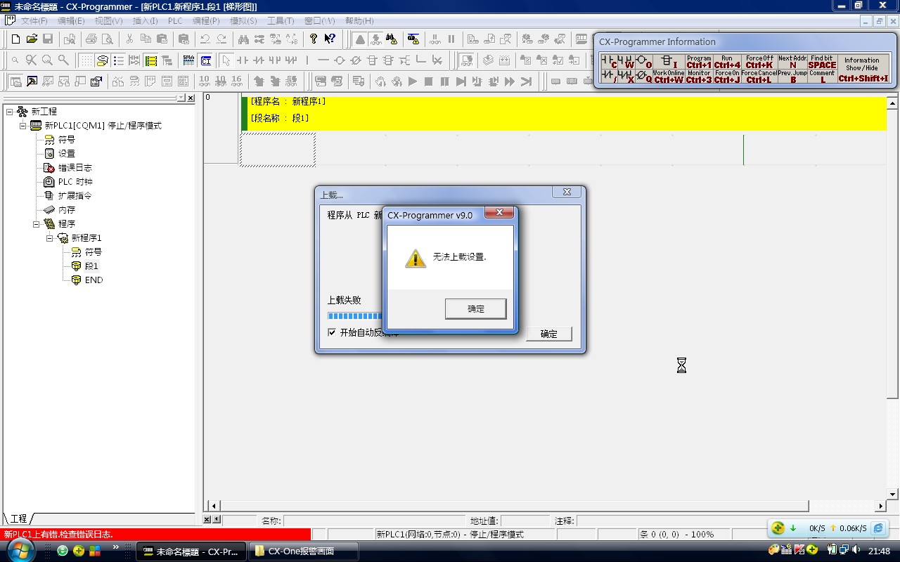 之前裝的是Programmer 1.0 CP1E專用的軟件,卸載了之后裝的CX-One 4.0,能將程序傳送到PLC,但從PLC下載程序,卻出現了以下畫面,請高人指點。。。 。。。多謝!