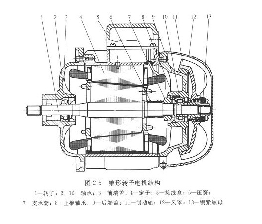 定子內腔和轉子外形都呈錐形的電動機。它具有停電自制動的能力,廣泛應用于電動葫蘆、卷揚機等起重設備。