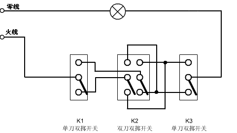 上圖是三地控制一盞燈 的電路,如果要將邏輯用梯形圖來表達,因為有橋接電路,不能直接用梯形圖畫出來,需要按照“從上到下,從左到右”的原則將每種邏輯(支路)畫出來: