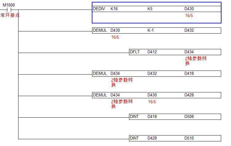 D434是個浮點數,占用了D433到D434的位。。運算接果會出錯。。。這個程序這個人還不知道浮點數計算時,結果占用4個寄存器。。。