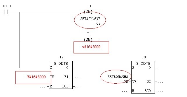 西門(mén)子300定時(shí)器的時(shí)間設(shè)定有兩種方法,一種是W#16#3999     另一種是  S5T#2h46m30s   第一種方法我在程序里面輸入不進(jìn)去,輸入了是紅色的,  這個(gè)是用在那里? 方框型和  線圈都輸入不了,真是郁悶了。