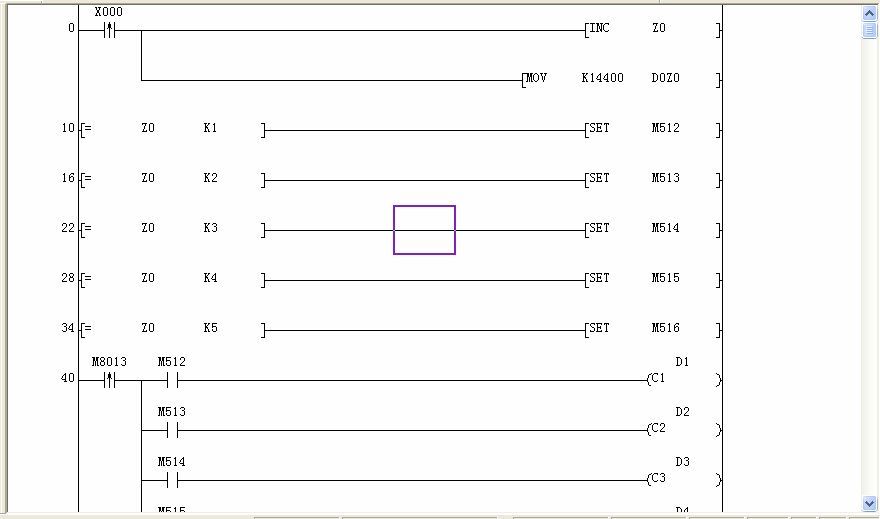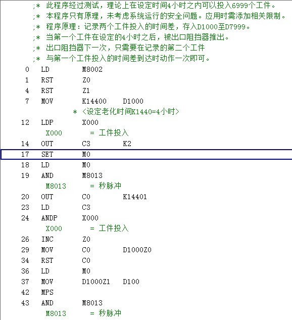 此程序為5臺產品老化,每臺產品老化時間四小時的程序.假如老化產品是900臺.按此編寫,程序太長,并超過了PLC內部(C).該怎樣優化編寫此程序? X0為進口開關,Y0為出口阻擋器. 歡迎下載程序討論建議!
