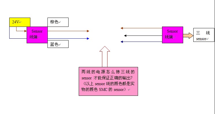 一般棕色接正,藍色接負,多一條信號線看是什么類形的傳感器