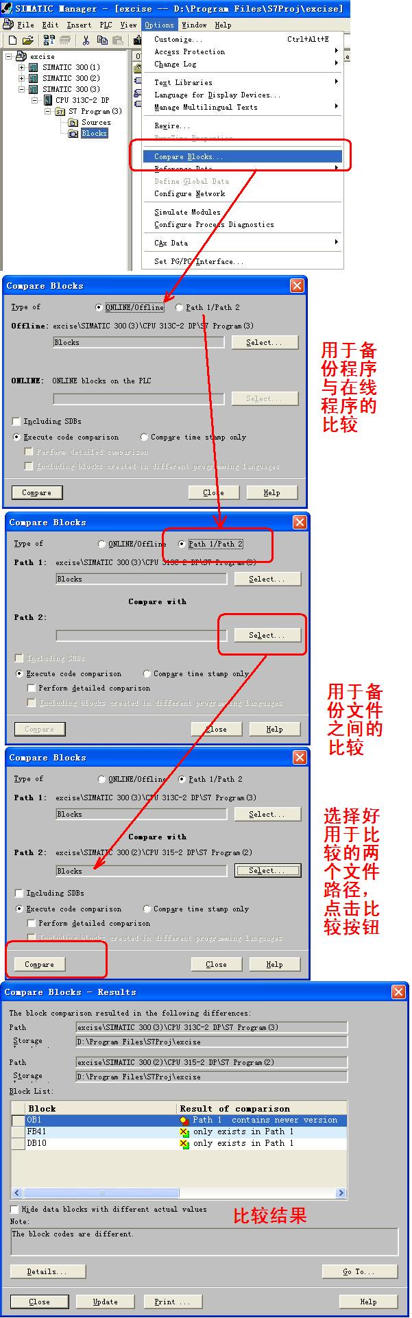 S7-300可以進行離線程序與在線程序的比較,也可進行離線程序之間的比較。