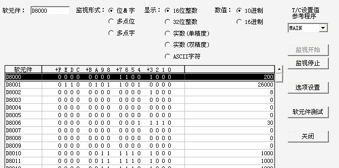 首先,把PLC連接好,然后轉到 監視模式 ;在監視模式后   在線—監視—軟元件批量 彈出上面對話框,最后在軟元件輸入D8001 單擊  監視開始  按鈕就可以啦