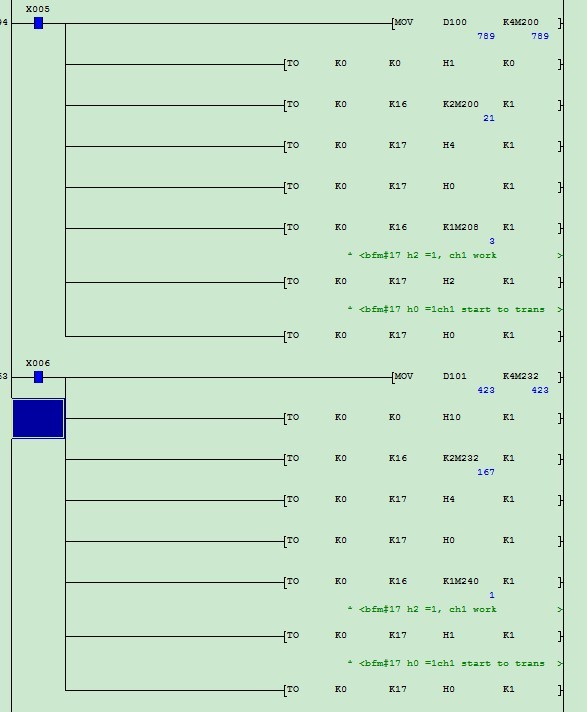 請大家幫幫忙 我在做一個FX2N_2DA。的配置位置0,想讓 通道1 發送電壓信號通道2發送電流信號。請問我這樣寫正確么 感謝啊,另外怎么用一個通道 同時發送電流跟電壓信號,看到有的帖子說可以啊  再次感謝啊